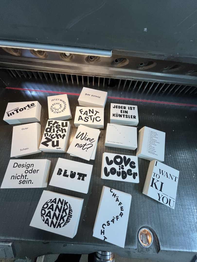 Von Visitenkarten, Weihnachtskarten, Einladungen, Bierdeckel, über Couverts, Briefpapier, Leinwand, Klebeetiketten, Sticker, bis Metallschilder, Plexiplatten, Glas, Holz und vieles mehr.
